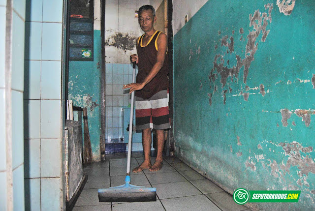 SEPUTARKUDUS.COM, BARONGAN - Di kamar mandi umum yang bersanding dengan musala di Taman Bojana, Kota, Kudus, terlihat seorang pria mengenakan kaus singlet sedang duduk melamun sambil menghisap rokok. Pria beruban itu bernama Totok (52), warga Tasikmalaya yang rela menjadi penjaga WC umum demi menghidupi keluarganya di kampung halaman.| Totok sedang menjaga WC Umum di Taman Bojana, Kudus. Foto: Ahamad Rosyidi |